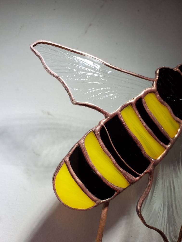 Skip to contentOOAK Stained Glass Bee Garden Stake. Cute little bee ready to search for yummy flowers in your yard and gardens! Made upon order receipt. The bee is 4.5 long by 5.5 inches wing span. Set on a 10 inch long steel rod.