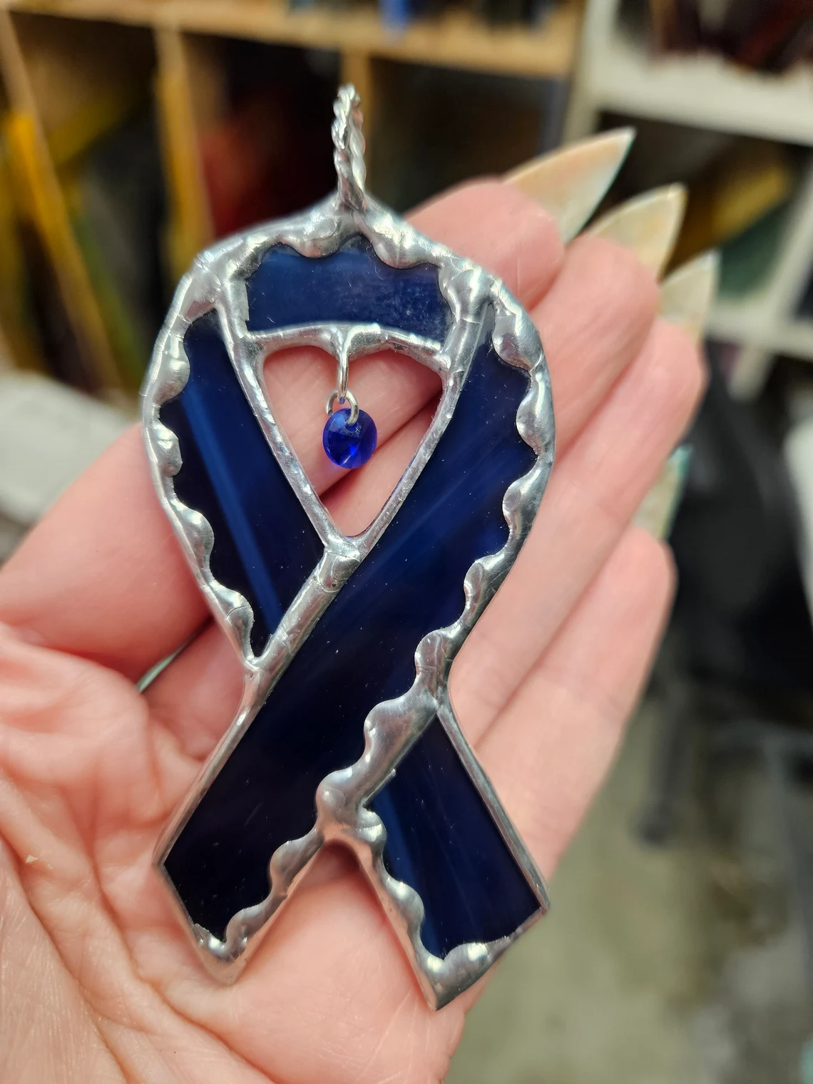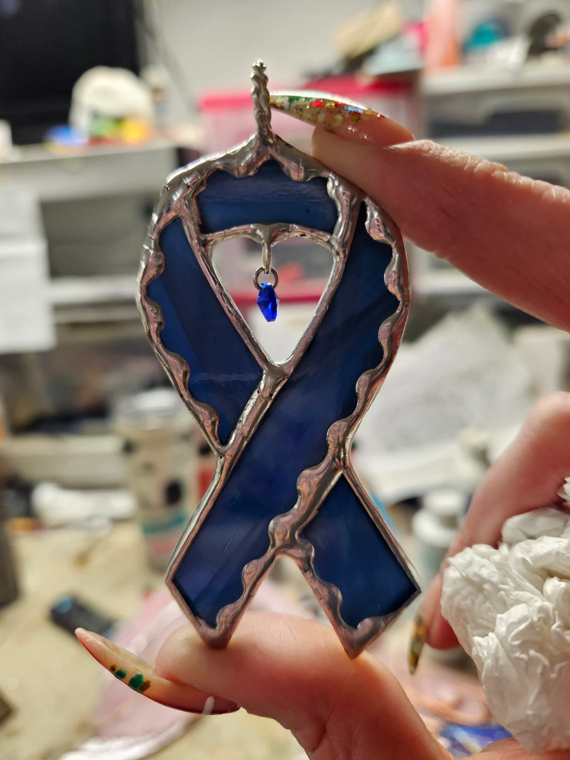 Skip to contentStained Glass Cancer Ribbon. These can be made in any color. They can also be requested to be made in other sizes. 3 inches long by 1.5 wide. The crystals can be added in any color as well.